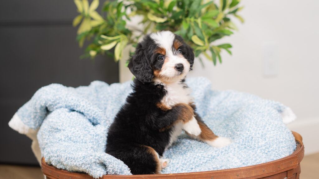 A Bernedoodle is a combination of the Bernese Mountain dog and a Poodle, characterized by active loyalty, intelligence, calmness, and strength. These puppies are perfect for both individuals and families. Contact us today to learn more!